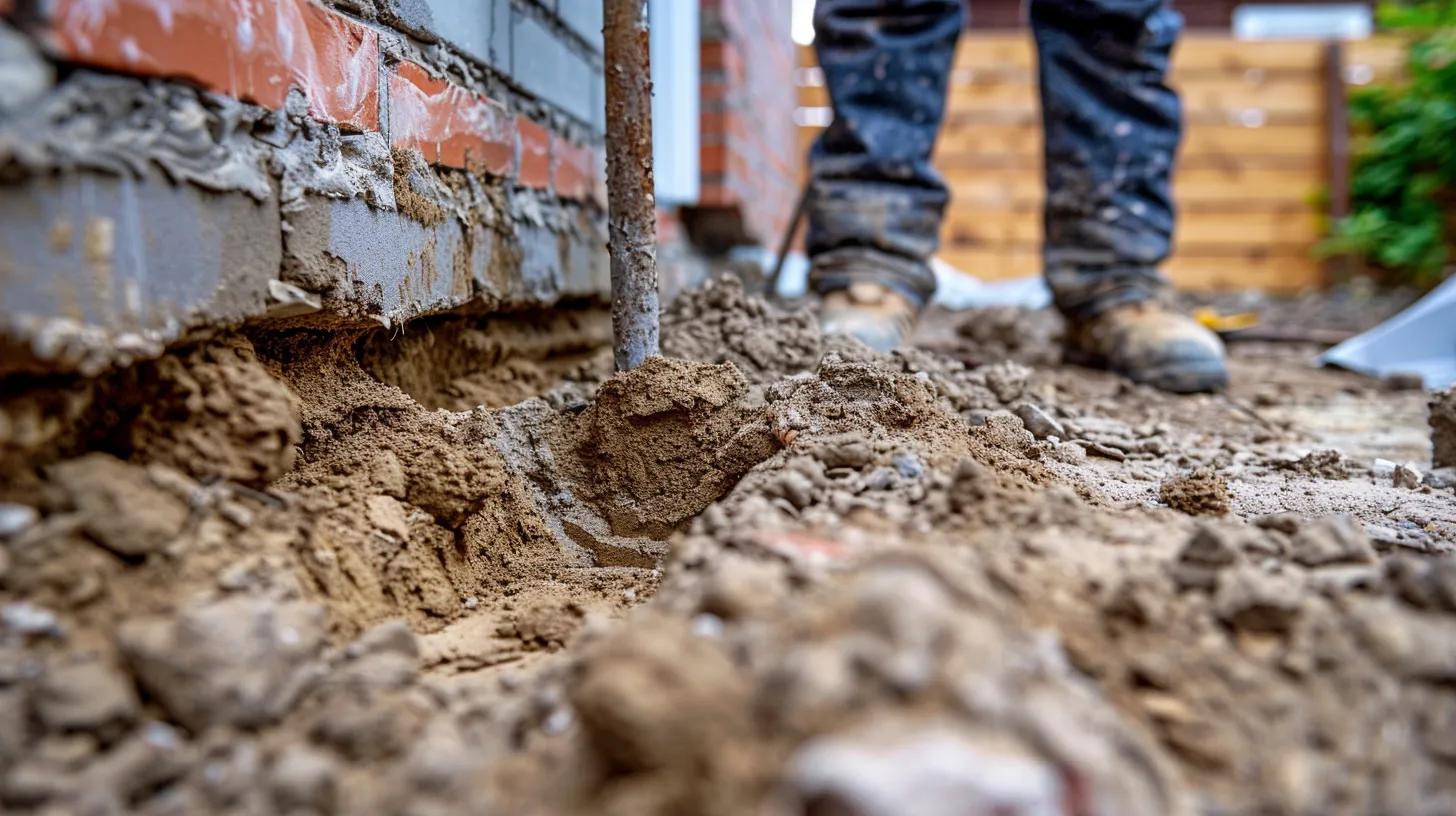 Soil excavation near a foundation with a metal rod inserted for stabilization, illustrating foundation repair techniques related to soil injection technology.